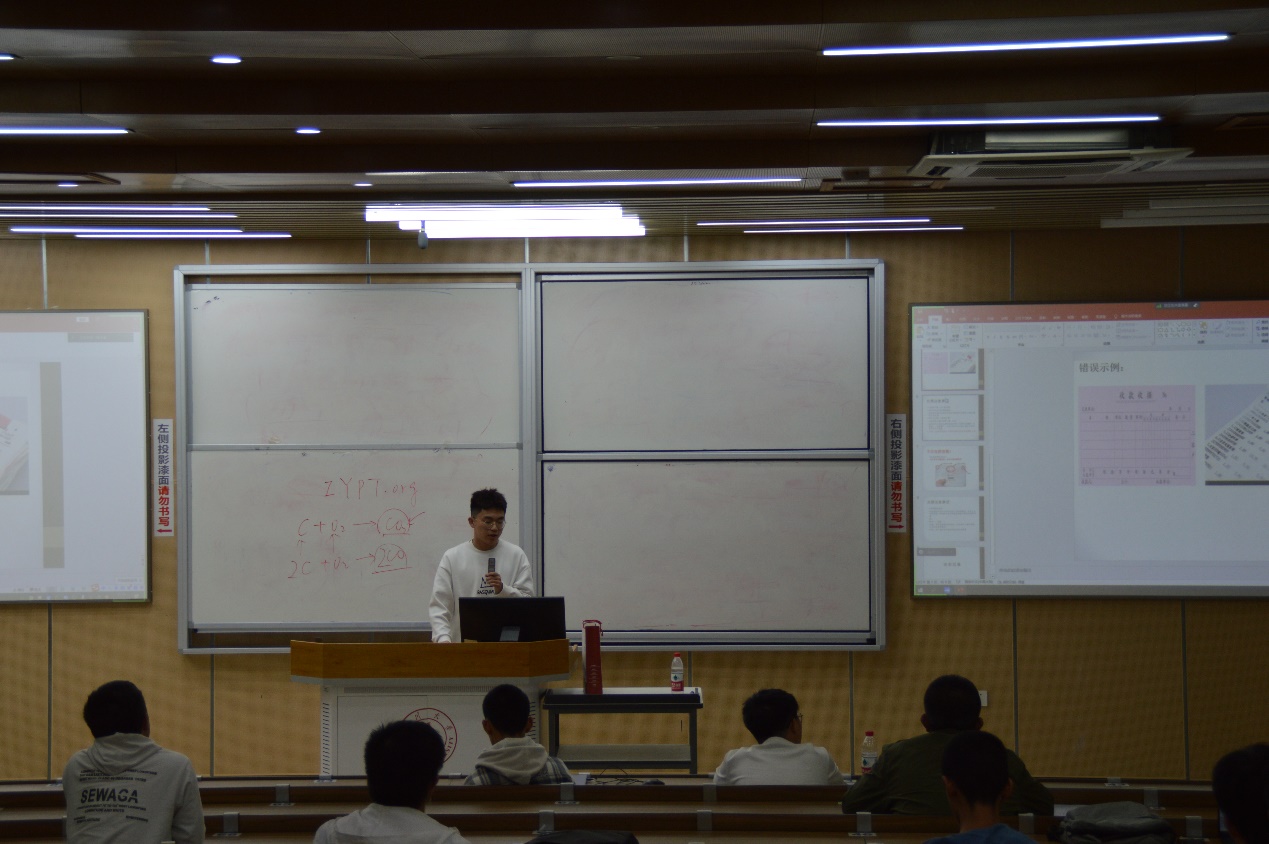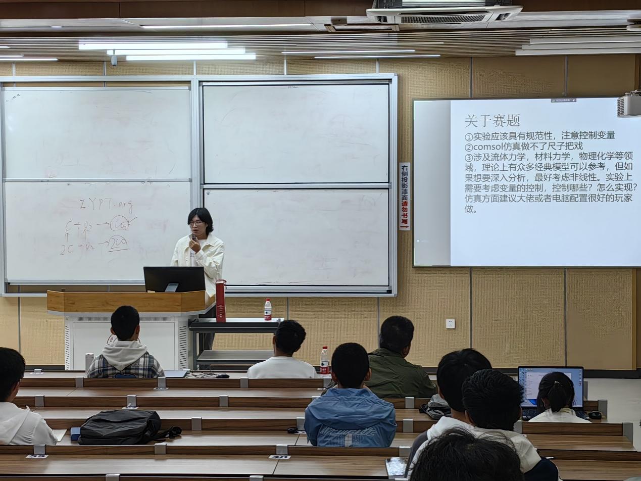 开幕式正式开始后,周荣教授为同学们做开幕式的致辞。周荣教授表达了对参赛同学们的欢迎和鼓励,也对大家能够在CUPT中获得进步和成长的给予了殷切希望。随后,林方老师向大家详细介绍了CUPT在国际上的悠久历史,并通过以往比赛中的典型案例阐释了CUPT不同于学科竞赛的独特性,以及其与科研中前沿课题之间的紧密联系。此外,林方老师还就比赛过程中的心态调整、时间管理、节奏把控等方面做出了相应的建议,鼓励同学们培养持之以恒的研究习惯。接下来,朱帅同学为大家讲解了实验室使用规则以及报账的相关事宜,并以图片案例对发票的细节要求做出了补充。最后,陈泳潜同学向大家展示了此后一系列沙龙的时间安排,重点强调了实验室的安全问题和实验操作的严谨性,并对比赛中相关辅助软件的使用做出了建议。