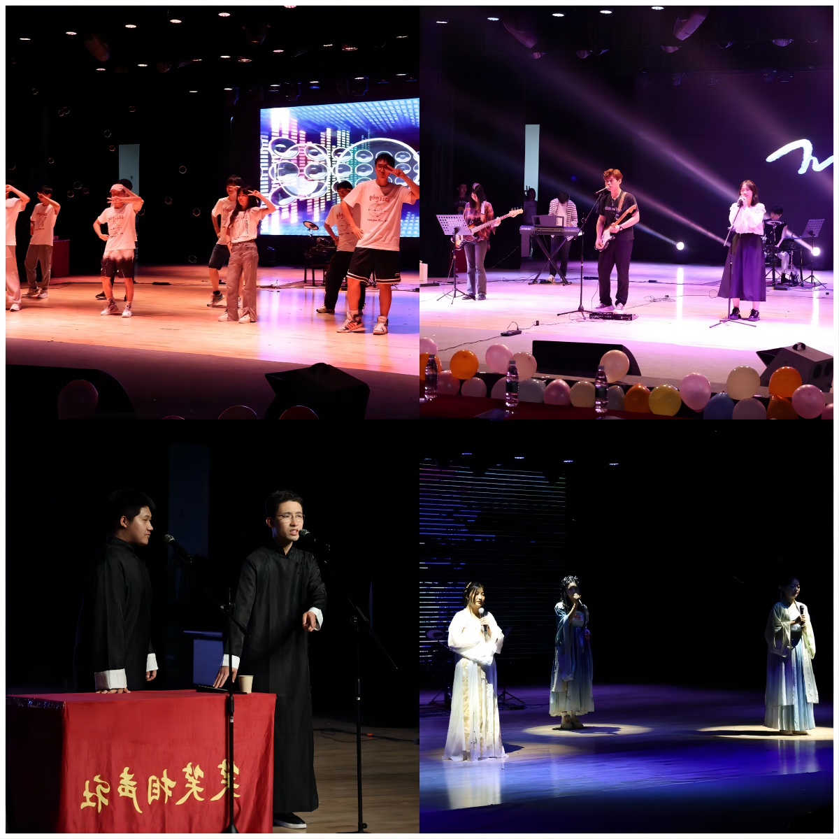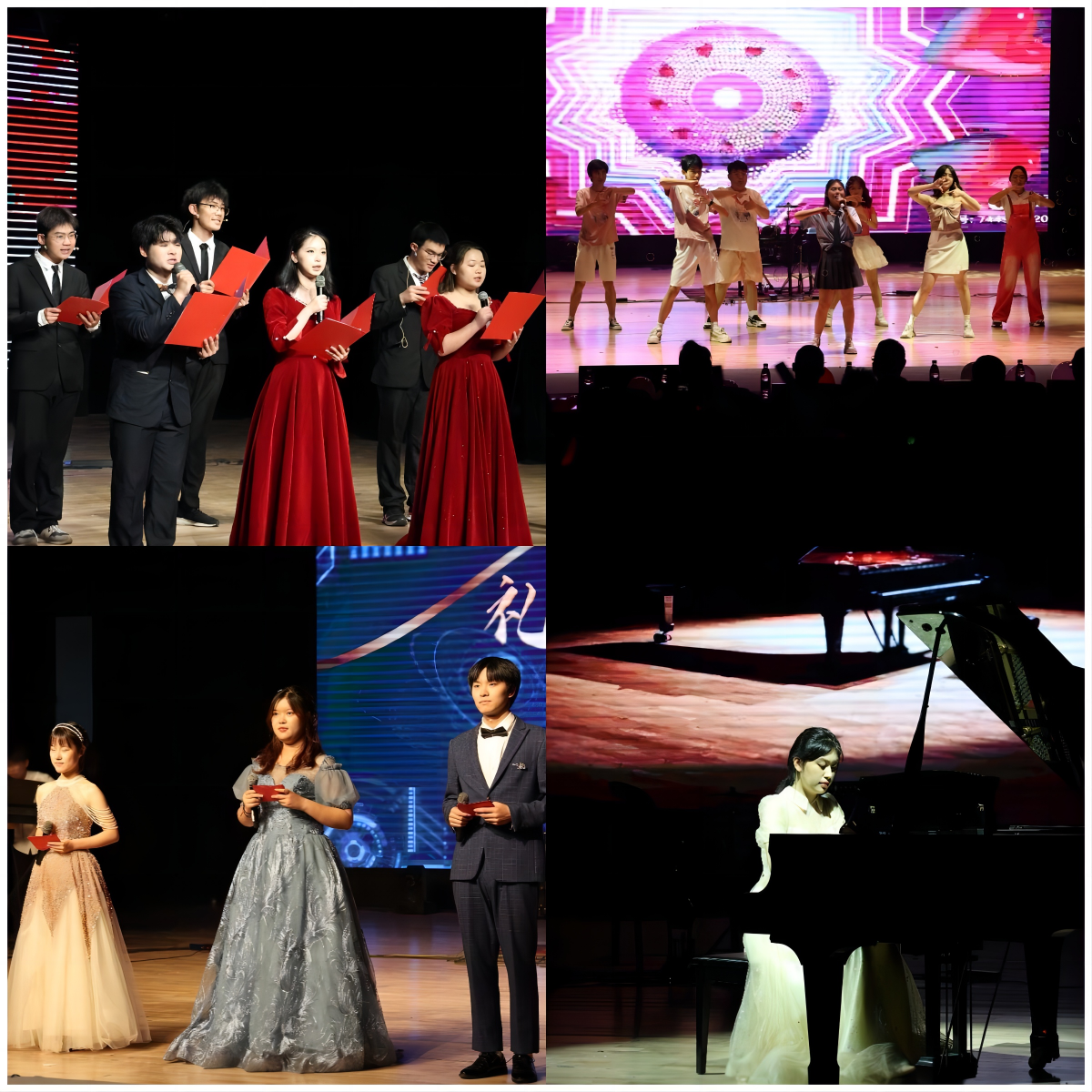 接下来,精彩的表演继续进行。串烧唱跳rap的同学神采奕奕,活力四射,动感十足,获得阵阵掌声;方言配音秀中,表演者巧妙选取了同学们熟悉的视频,用有趣的配音让大家笑逐颜开;钢琴弹奏《降G大调练习曲》让大家感受到钢琴的典雅之美;朗诵《祖国啊,我亲爱的祖国》激起了同学们深埋心底的爱国之情;乐队演奏歌曲串烧让大家跟着明快的节奏,尽情享受音乐带来的律动感;舞蹈《咆哮》则让同学们感受到了青春的活力与激情。在欣赏了这些有声有色的表演之后,相声《量子力学和广义相对论在相声创作和表演中的指导及应用》则将抽象难懂的物理知识通过相声表演这一形式呈现在大家面前,巧妙地引导大家去思考,让大家听后交口称赞;感受了物理学之精妙,歌曲演唱《借月》又将大家引入音乐的美妙当中;魔术表演为同学们呈现了一场神秘的视觉盛宴;吉他指弹在阵阵掌声中展现了高超的技艺。最后,在公司团委员工会各部门同学带来的舞蹈串烧中圆满结束。