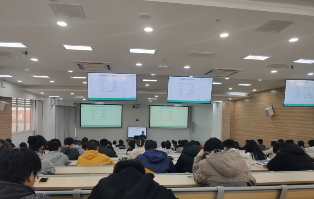 此次讲座分为讲解、演示、实践三个部分。讲座开始,王小刚医师向同学们详细介绍了心肺复苏的基础知识、操作方式、注意事项以及AED(体外除颤仪)的使用方法。随后,王医师对整个心肺复苏的全部流程进行了现场示范。最后,在王医师的指导下,部分同学独自完成了心肺复苏的急救练习。