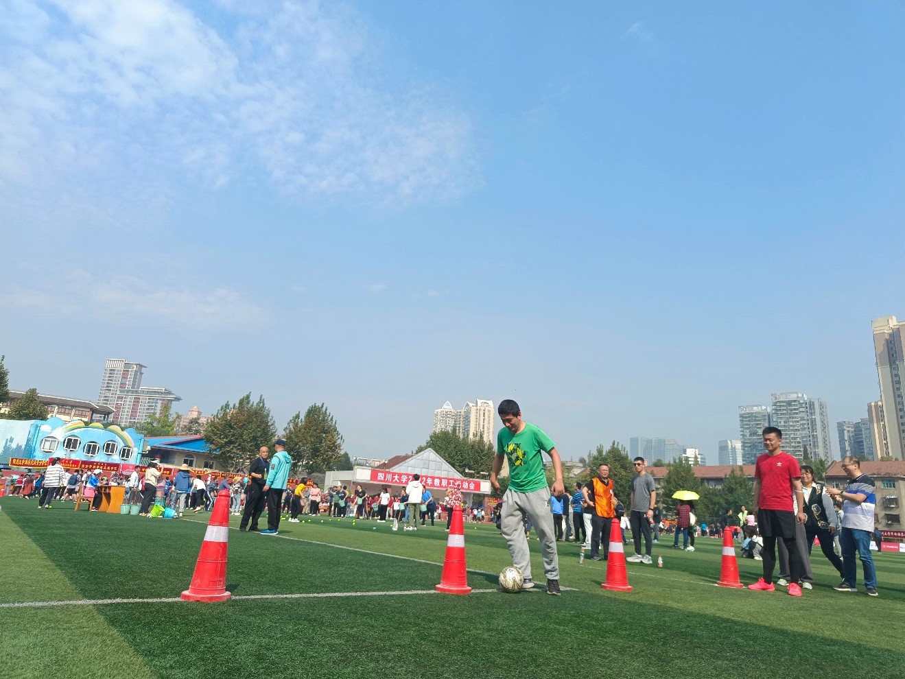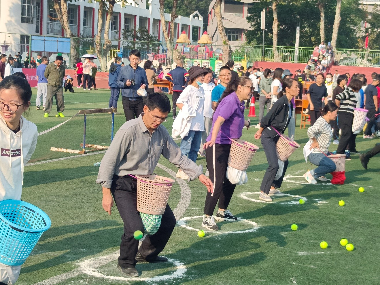 本次教职工运动会包含了男女100米、跳远、铅球和实心球等个人竞技性项目,同时还有跳绳、12*60米接力、定点踢球、抛球入框和毛毛虫竞速等趣味和竞技相结合的团体类项目。公司教职工参加了100米跑、跳远、双摇跳、铅球和原地掷实心球等单人项目,并参加了长绳、抛球入筐、毛毛虫和绕杆踢球射门团体项目。比赛场面十分热闹,整个过程充满趣味性和挑战性。