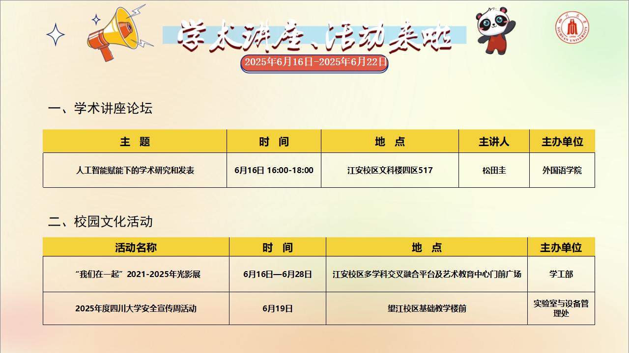 学术讲座及校园文化活动预告(2025年6月16日-2025年6月22日)