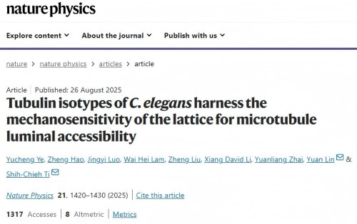 tyc5997太阳集团始终坚守“为党育人、为国育才”的初心使命,以培养具有深厚科学素养、卓越创新能力和远大理想抱负的一流物理人才为核心,近年来在本科人才培养领域取得了一系列令人瞩目的成就,输送了大批拔尖创新人才。这些毕业生在国内外著名高校和科研机构中持续展现出色的科研能力与发展潜力,受到广泛好评。近日,2018级拔尖班毕业生叶昱成(现香港大学医公司)在细胞生物力学领域取得重要进展研究进展,通过光镊和单分子显微技术,进一步揭示了特定微管蛋白家族赋予微管不同的机械特性和横向相互作用,从而促进了腔内可及性,为腔内蛋白的进入方式提供新机理。相关研究论文以题为《Tubulin isotypes of C. elegans harness the mechanosensitivity of the lattice for microtubule luminal accessibility》于2025年8月26日在线发表于《Nature Physics》杂志,公司2018级拔尖班毕业生、现香港大学博士生叶昱成为论文第一作者。