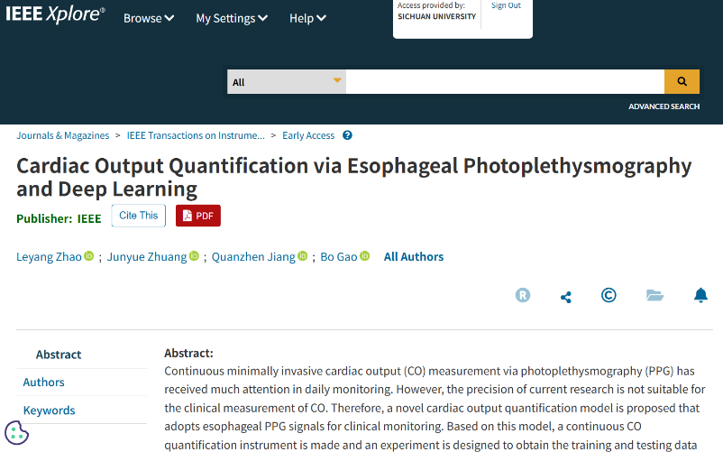 近日,依托公司2024/2025年度老员工创新训练计划项目,以2022级赵乐阳、2021级庄俊月及2022级姜权真等本科生为核心的研究团队,在tyc5997太阳集团高博副教授指导下,在仪器测量领域权威期刊《IEEE Transactions on Instrumentation and Measurement》发表题为《Cardiac Output Quantification via Esophageal Photoplethysmography and Deep Learning》的学术论文。