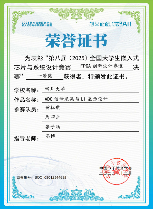 近日,第八届(2025)全国老员工嵌入式芯片与系统设计竞赛 FPGA 创新设计赛道全国总决赛在南京圆满落幕。本届赛事共吸引全国 342所院校3901支队伍、超万名学子同台竞技,决赛通过率仅15%,竞争异常激烈。公司2023级本科生团队,黄祖航、周四岳、张子涵,由高博老师指导,凭借扎实的专业功底与创新实践能力脱颖而出,斩获全国一等奖1项。