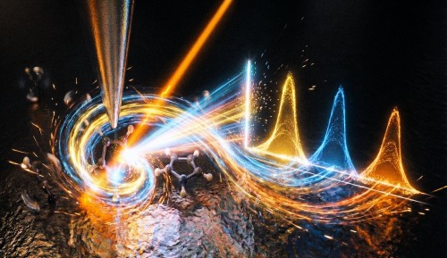 一项新研究通过将激光与扫描隧道显微镜创新结合,首次捕捉到单个分子独特的振动“声音”。图片来源:梁康楷/Google Gemini/UC San Diego Physical Science。