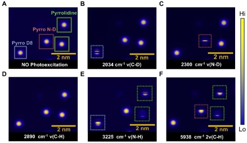 研究进一步展示了IRiSTM在单分子化学识别与成像领域的独特潜力。团队将普通吡咯烷、N–D取代体与全氘代体共沉积于同一表面,三者在常规STM形貌表征中几乎难以区分;而通过将红外频率调至特定化学键的特征振动(如ν(C–D)与ν(N–D)),对应同位素分子可被选择性"唤醒",并在STM视野中呈现特征响应,从而实现了同位素级别的单分子区分与"化学点名"。这一能力的核心价值在于,它将过去仅能在系综平均意义上讨论的分子异质性,转化为可逐个验证、且具备空间定位能力的实验事实,为单分子水平的异质性研究提供了全新手段。