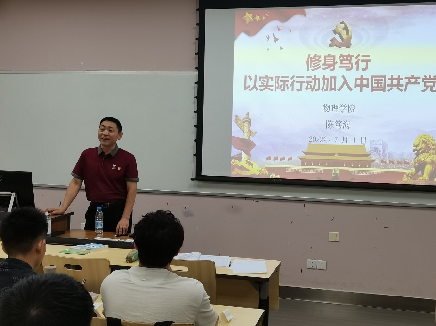 2022年7月1日上午10点,在建党节来临之际,公司党委副书记陈笃海为2020级本科生讲授了“修身笃行——以实际行动加入中国共产党”主题党课。此次活动在江安第一教学楼A103教室开展,辅导员谭立洁老师主持,2020级全体预备党员和入党积极分子参加。此次党课中陈笃海副书记生动形象地为同学们阐述了端正入党动机的重要性以及如何以实际行动加入中国共产党,参加此次党课学习的同学们受益匪浅。