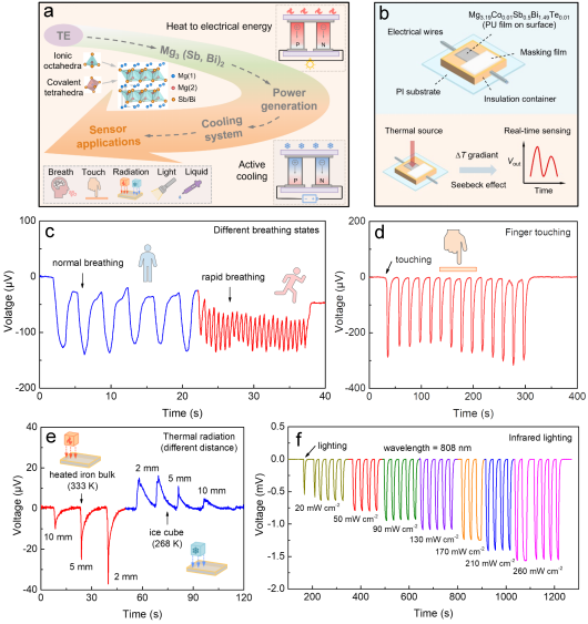 传统的固态Mg3(Sb, Bi)2热电研究主要聚焦于提升热电性能及发电制冷效率,较少涉及其他潜在应用领域,限制了热电材料的发展。昂然研究员团队通过间隙Co掺杂显著提高该材料的热电性能,成功实现483 K下27.3 μW cm−1K−2的功率因子,并展现400 MPa的抗压强度及25%的应变能力。团队还创新制备了固态热电传感器,展示了在呼吸监测、手指触摸、热辐射、红外激光照射及液体接触等多场景中的卓越性能(如图4所示)。该研究为医疗、电子设备、核技术等领域开辟了新空间,相关工作发表于Cell Press期刊Device。tyc5997太阳集团在读博士生田邦州为论文第一作者,通讯作者为tyc5997太阳集团昂然研究员、孙强特聘研究员,论文第一单位为tyc5997太阳集团原子核科学技术研究所。