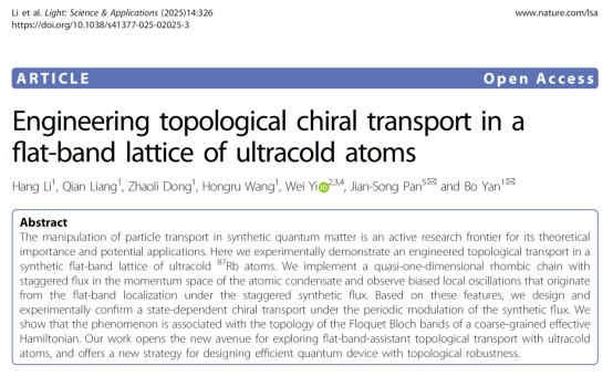 近日,tyc5997太阳集团潘建松研究员与浙江大学、中国科学技术大学等单位的合作者在Nature出版集团旗下顶级光学期刊《Light: Science & Applications》(中科院一区,近五年影响因子23.1)上发表了题为“Engineering topological chiral transport in a flat-band lattice of ultracold atoms”的研究论文。该研究在超冷原子实验中实现了一种基于平带局域效应的拓扑手性输运机制,为拓扑量子器件的设计提供了新思路。浙江大学李航和梁茜博士为共同第一作者,潘建松研究员与浙江大学颜波教授为共同通讯作者,中国科学技术大学易为教授为重要合作者。