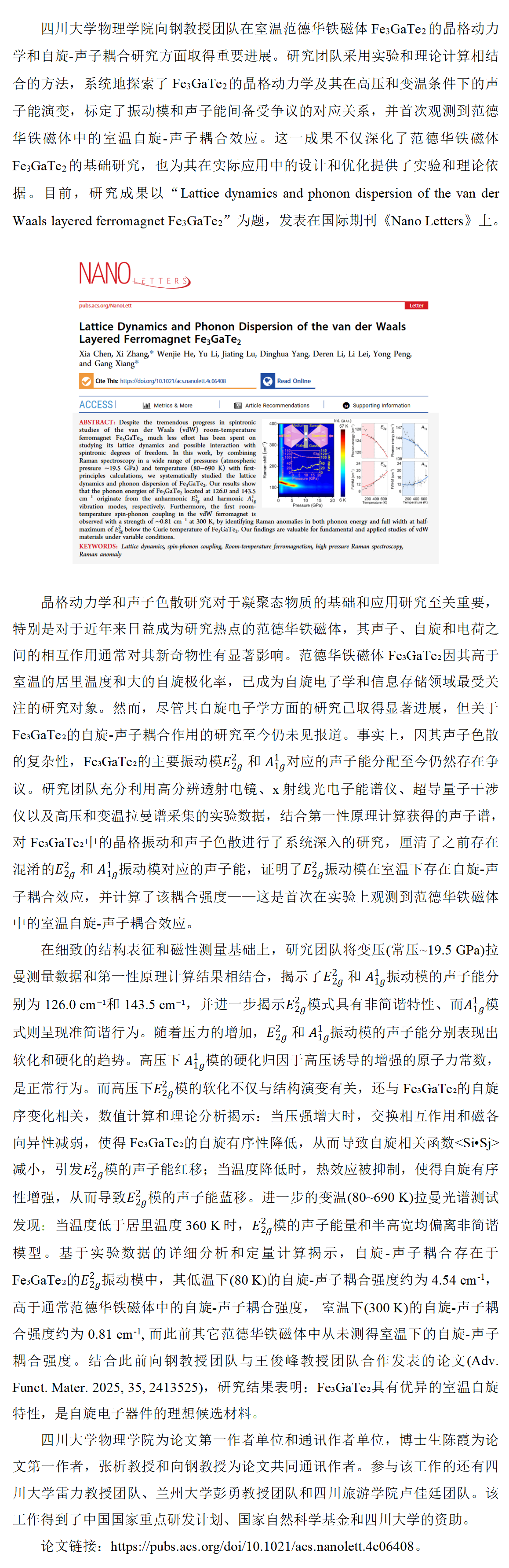 tyc5997太阳集团向钢教授团队首次观测到范德华铁磁体中的室温自旋-声子耦合效应